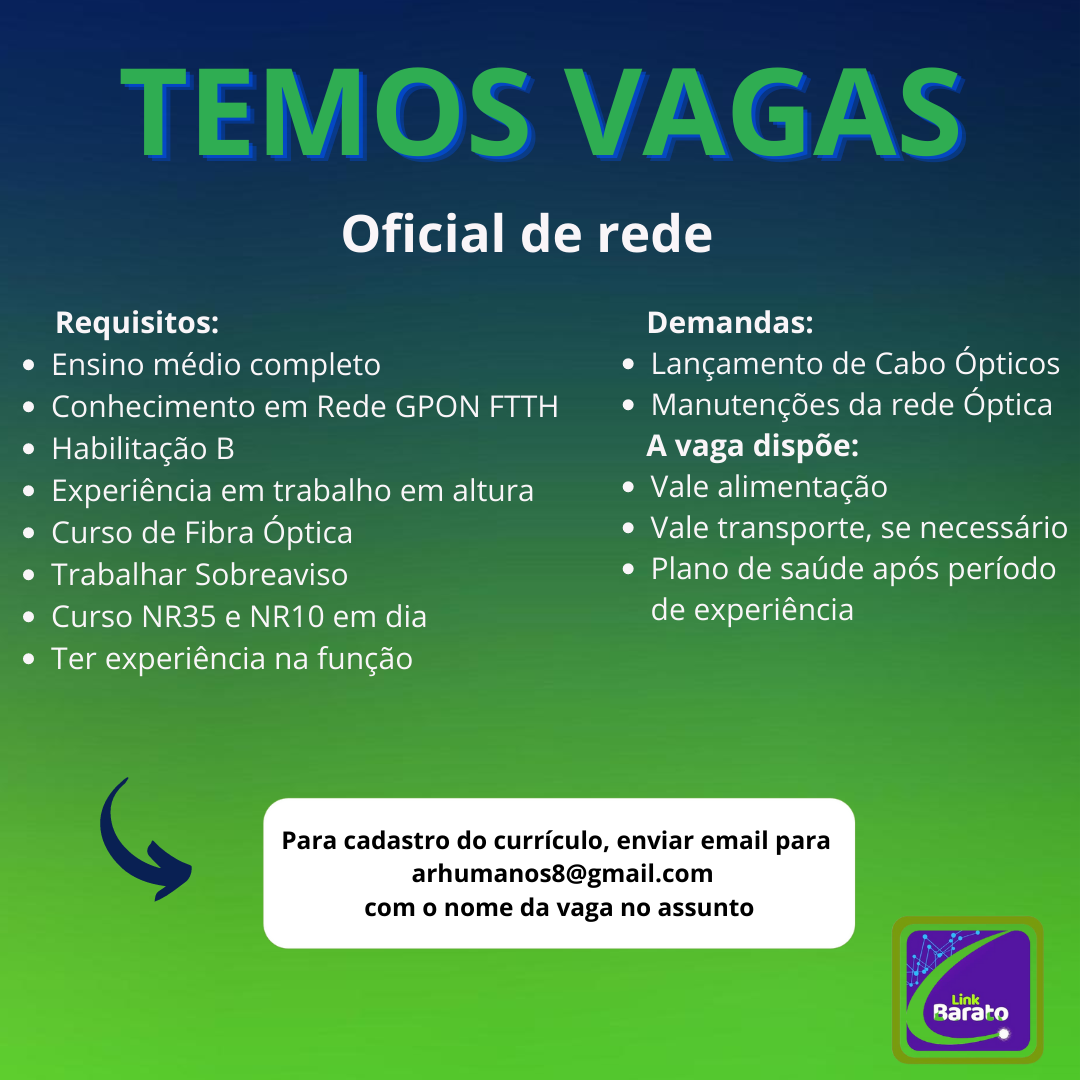 Empresa INFOLINK TELECOM contrata Oficial de rede com experiência